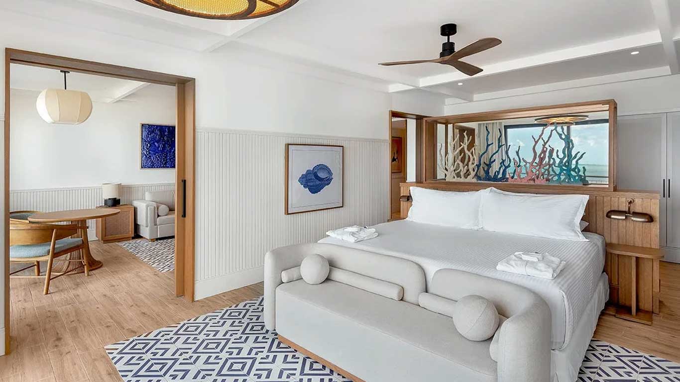 The Ocean Front Master Suite at Ocean Allure Costa Mujeres featuring a bedroom with a king-size bed, a separate lounge with a sofa bed, and a terrace with a jacuzzi where you can enjoy stunning front views of the ocean. By booking this Master Suite, you can enjoy all the Privilege services.